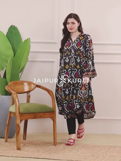 Carry a relaxed look with this Black Ikat Printed Muslin A-line Kurta. It has a V-neck, embroidered full sleeves with aari work, and a curved hemline.