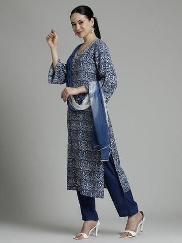Blue Ethnic Motifs Print Cotton Kurta With Palazzos & Dupatta