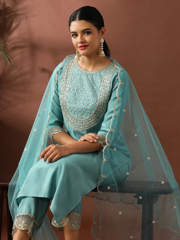 Floral Embroidered Straight Silk Blend Kurta & Trousers Sets