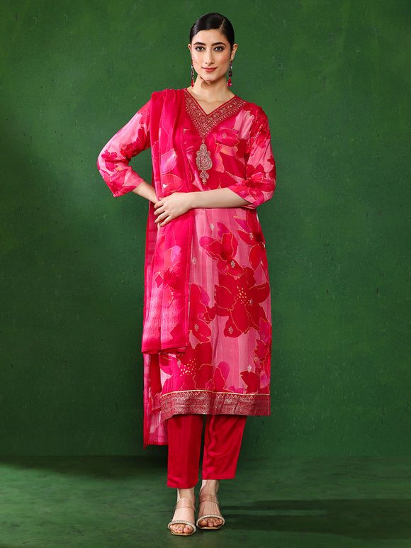 Floral Embroidered A-Line Silk Blend Kurta & Trousers Sets