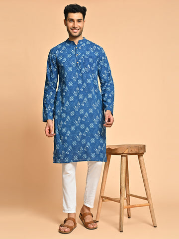Blue Embroidered Ethnic Printed Straight Cotton Kurta