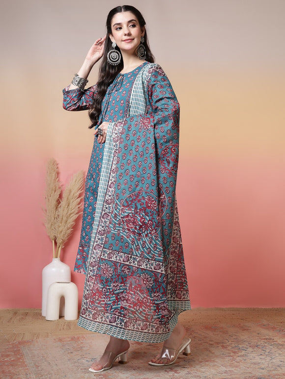 Ethnic Printed Blue Cotton Straight Kurta With Pants And Dupatta