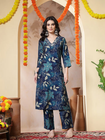 Floral Embroidered A-Line Silk Blend Kurta & Trousers Sets