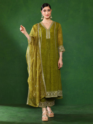 Embroidered Silk Blend Ethnic Motifs Kurta Sets With Net Dupatta