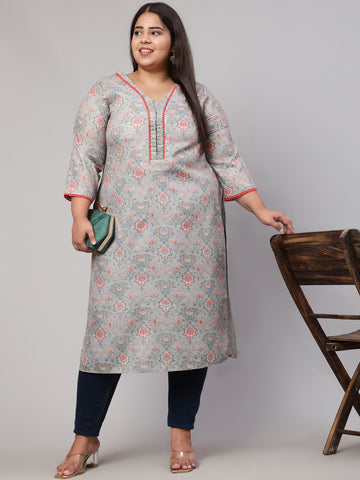 Plus Size Grey Ethnic Printed Kurta With Printed Afghani Salwar