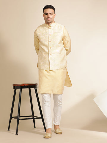 Silk Blend Beige Kurta With Woven Design Nehru Jacket Set