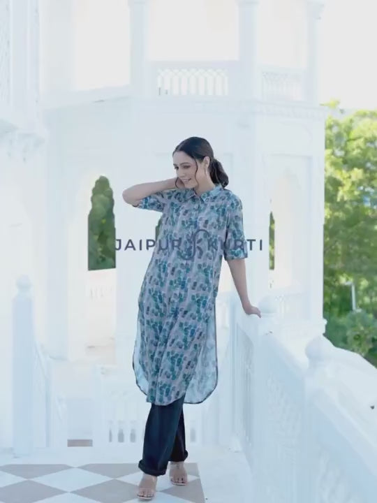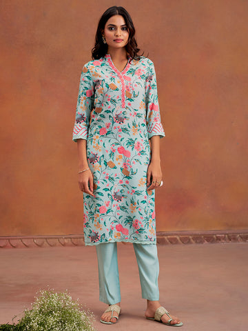 Blue Embroidered Ethnic Printed Straight Cotton Kurta
