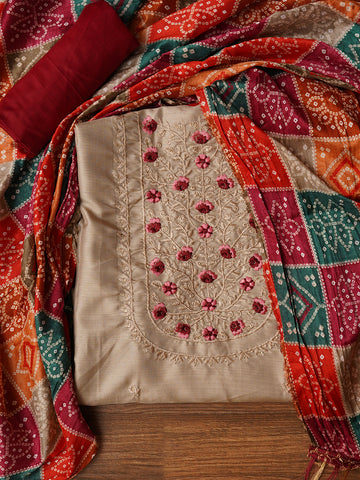 Cream Pure Silk Lucknowi Embroidered Dress Material with Dupatta