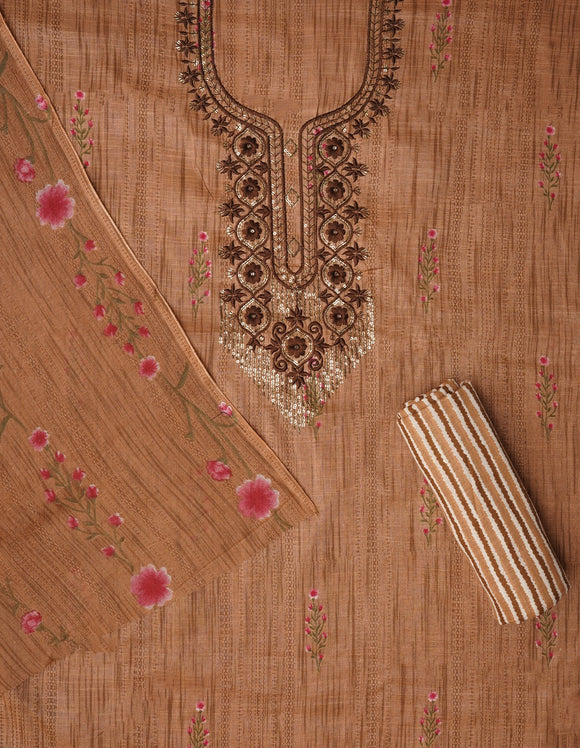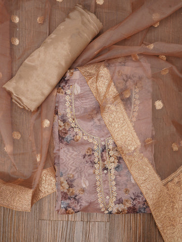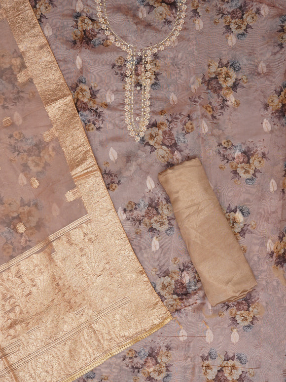 Beige Floral Printed Embellished Organza Dress Material with Dupatta