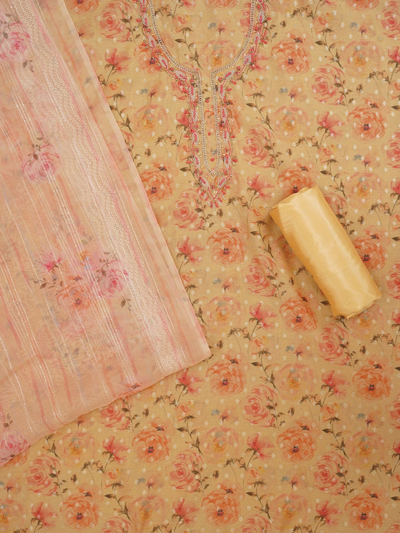 Beige Sequin Work Floral Printed Cotton Blend Dress Material with Dupatta