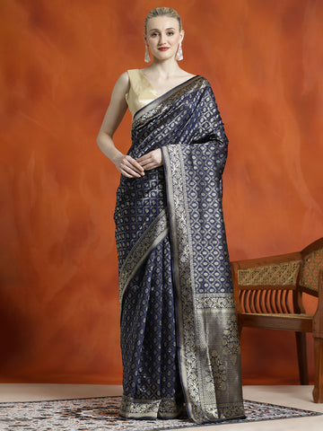 Navy Blue Floral Silk Zari Woven Dress Material with Dupatta