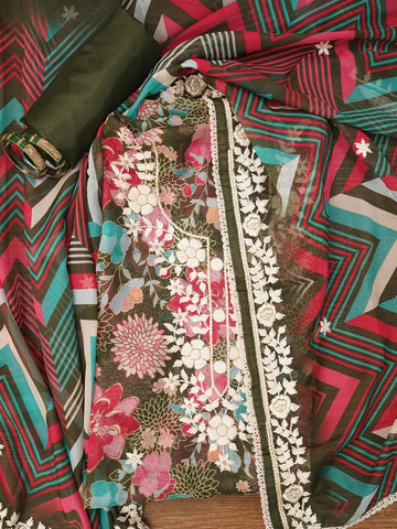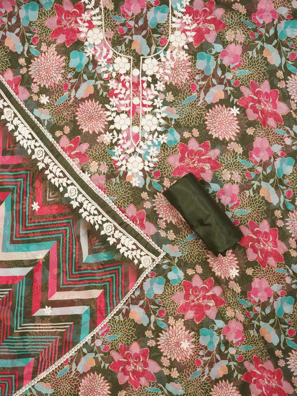 Olive Green Lucknowi Embroidered Organza Dress Material with Dupatta