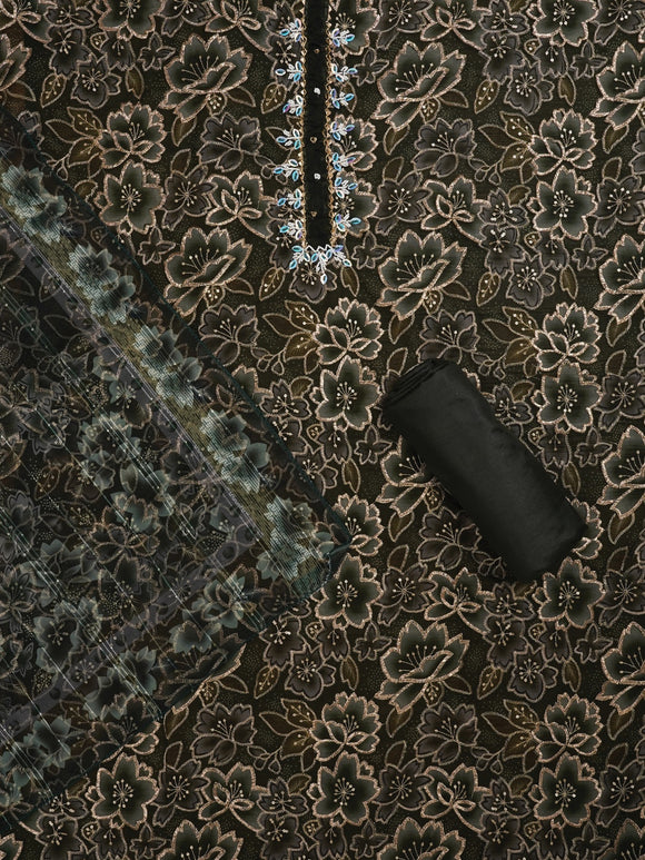 Olive Green Unstitched Embellished Organza Dress Material With Dupatta