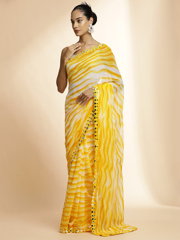 Yellow Pure Georgette Leheriya Mirror Work Saree Sale price₹ 1,529 Regular price₹ 3,999Save 62%