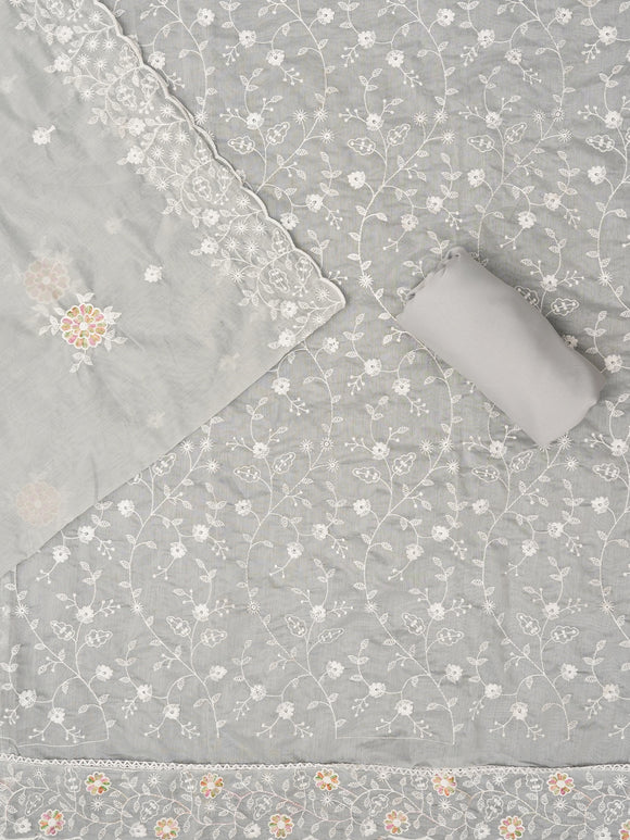 Unstitched Grey Embroidered Cotton Blend Dress Material With Dupatta