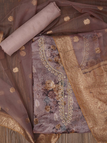 Rose Gold Embellished Floral Printed Organza Dress Material with Dupatta