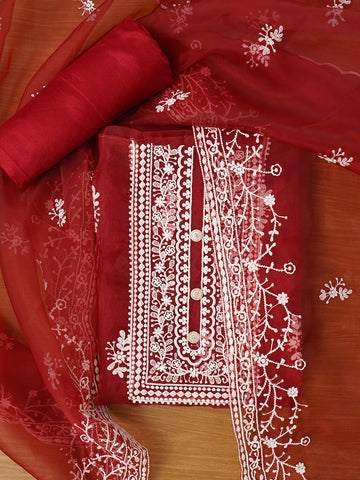 Red Thread Embroidered Organza Festive Dress Material with Dupatta