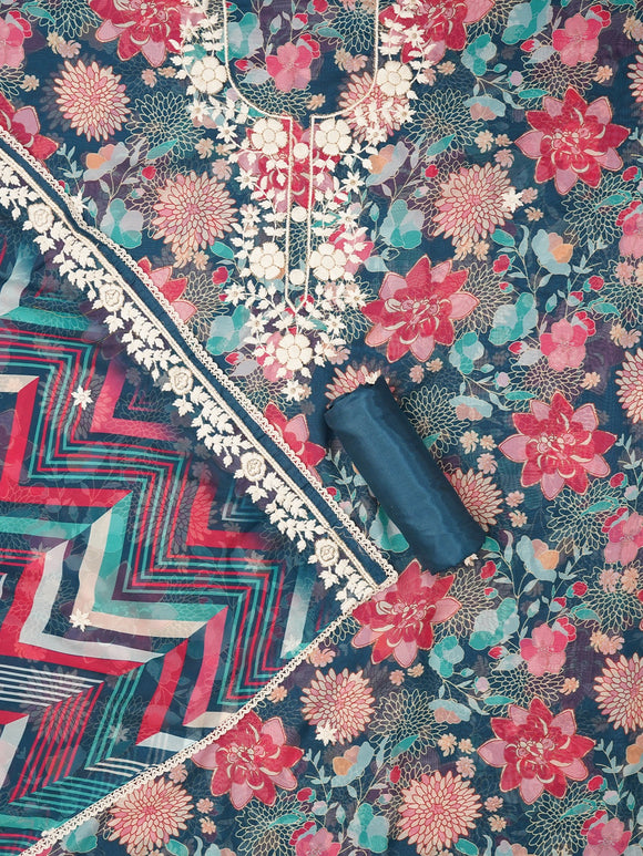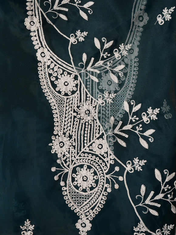 Teal Blue Lucknowi Embroidered Organza Dress Material with Dupatta