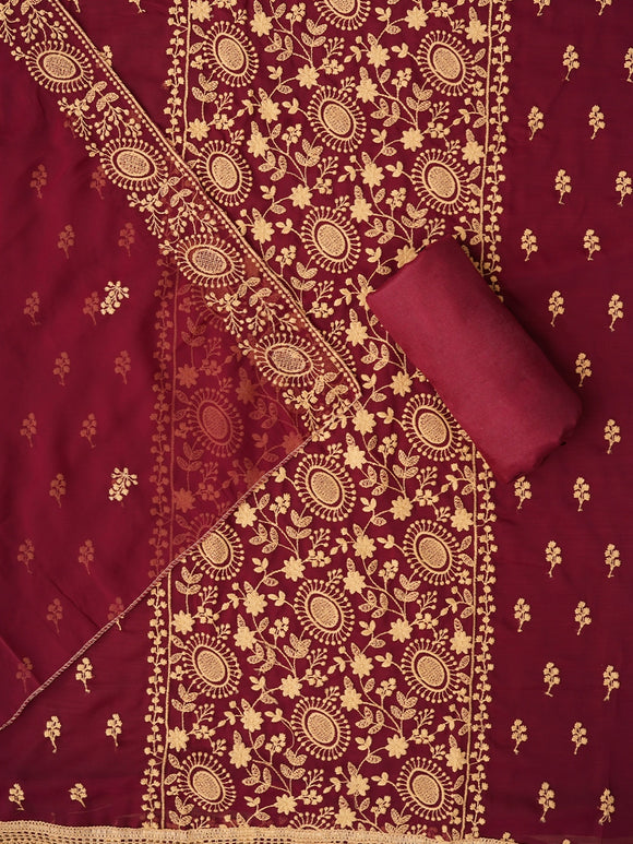 Maroon Unstitched Embroidered Organza Dress Material With Dupatta