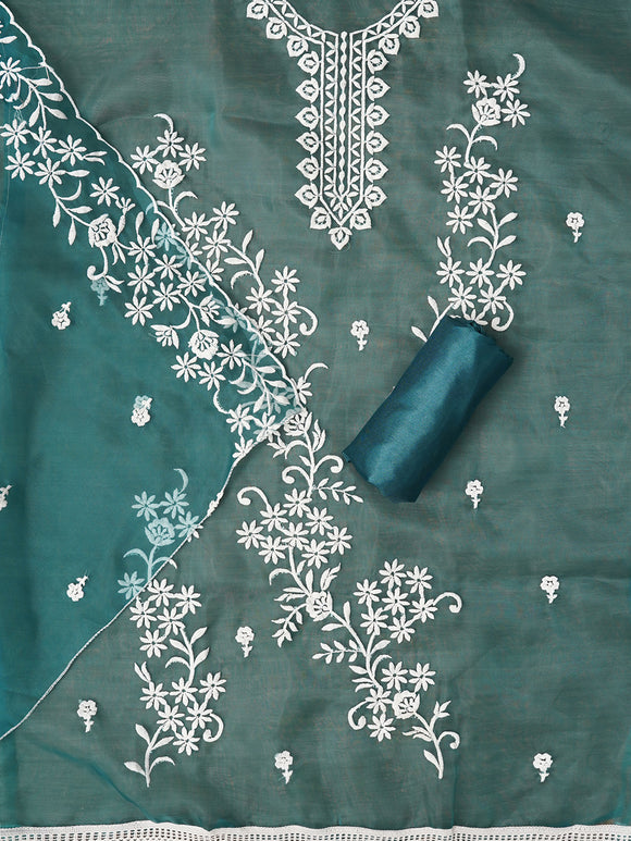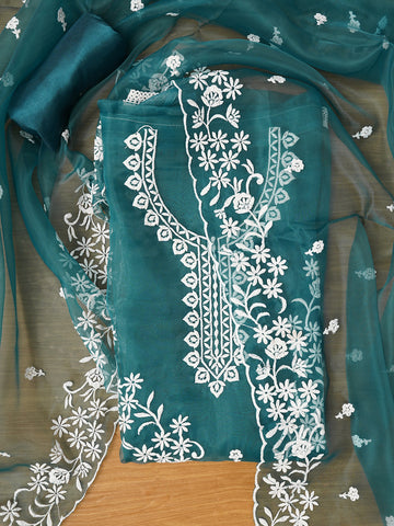 Teal Blue Lucknowi Embroidered Organza Dress Material with Dupatta