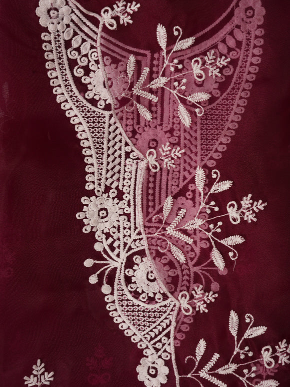 Maroon Unstitched Embroidered Organza Dress Material With Dupatta