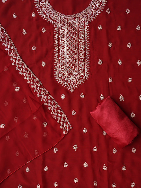 Maroon Zari Embroidered Organza Dress Material with Dupatta