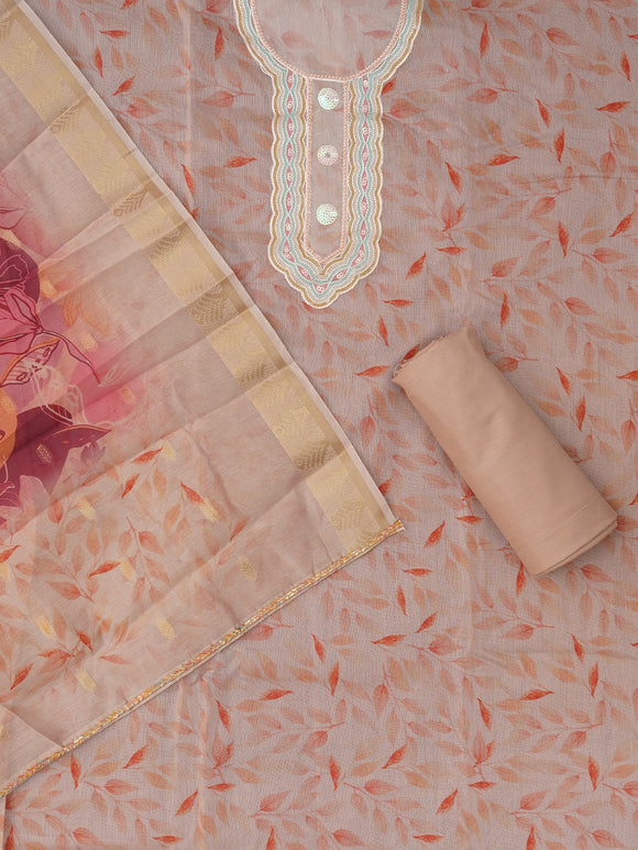 Unstitched Embroidered Peach Organza Dress Material With Dupatta