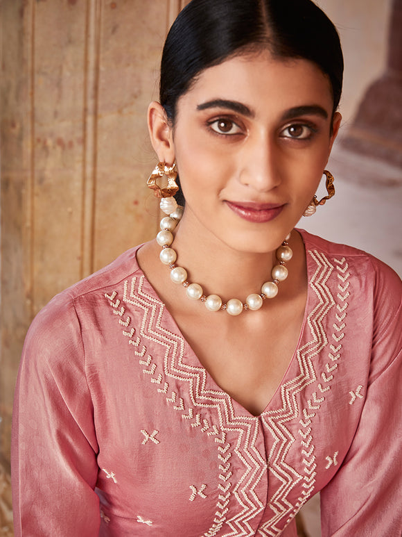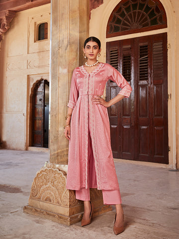 Pink Jaquard Hand Embroidered Anarkali Flared Kurta With Solid Palazzo