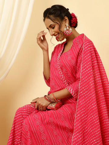 Fuchsia Pink Bandhani Angrakha Kurta With Leheriya Pants And Dupatta