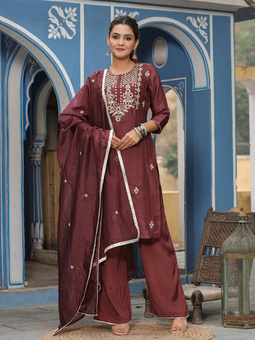 Mauve Straight Solid Embroidered Silk Kurta With Palazzo And Organza Dupatta