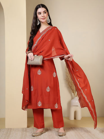 Floral Embroidered Straight Silk Blend Kurta & Trousers Sets