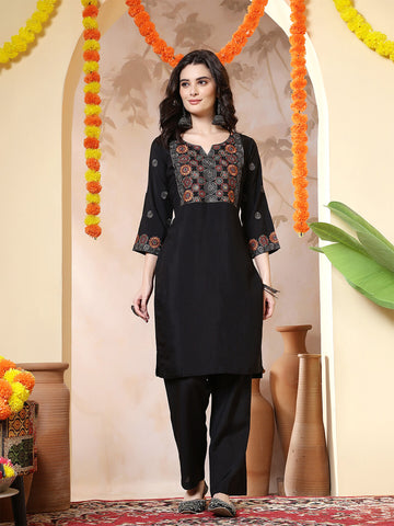 Floral Embroidered A-Line Viscose Rayon Kurta & Trousers Sets