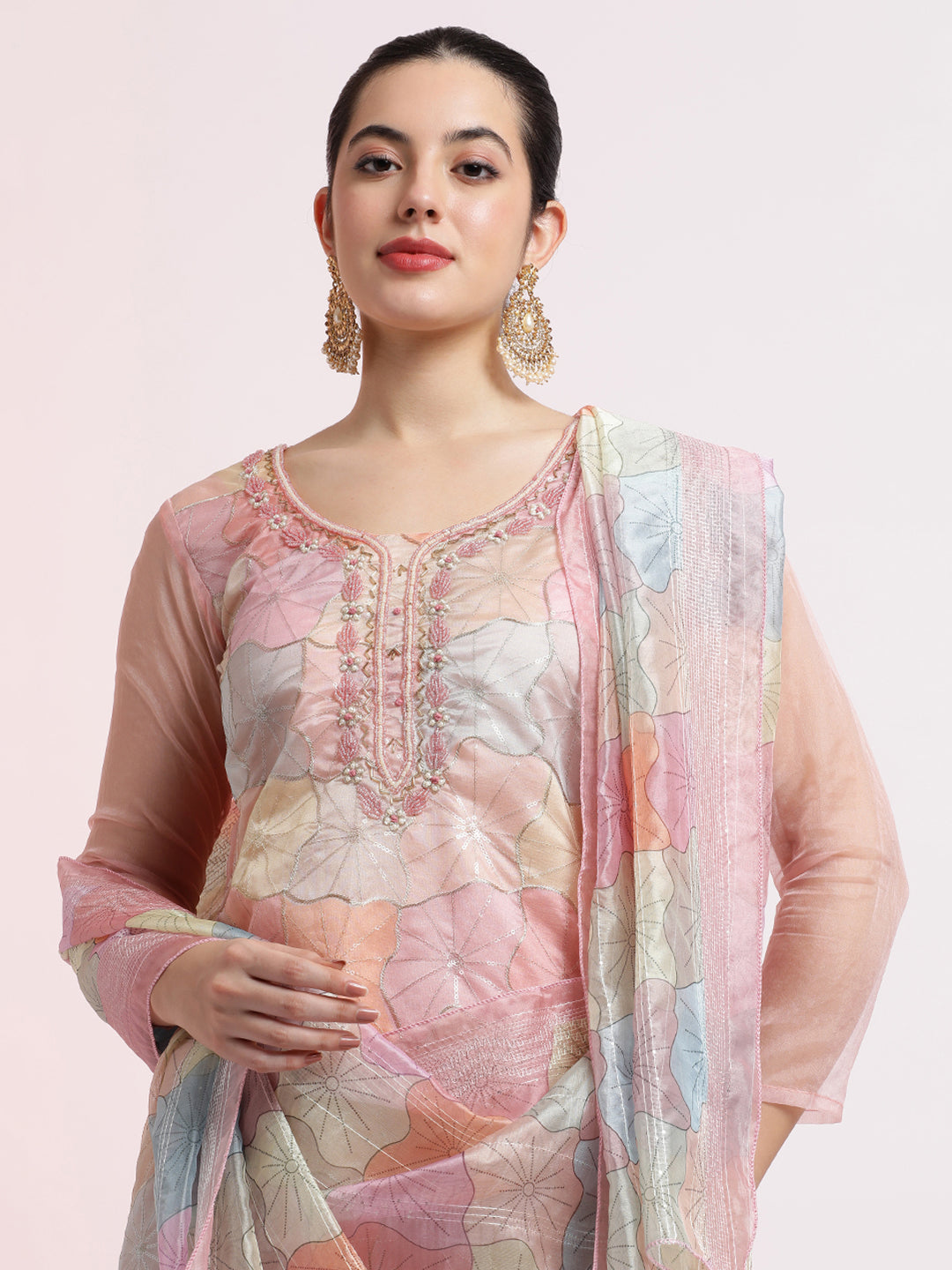 Floral Embellished Organza Festive Kurta Set With Dupatta