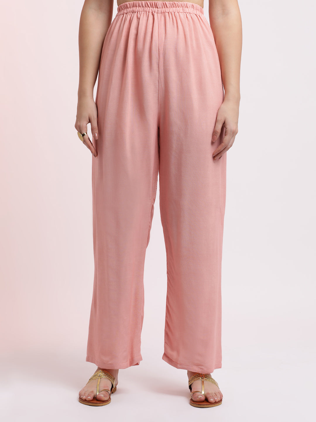 Embrace the subtle elegance of this Pink Floral Embellished Organza Festive Kurta Set With Dupatta. The kurta has a round neck, three-quarter sleeves, a straight hemline and embroidered details. It is paired with solid elasticated pyjamas and an embroidered dupatta.
