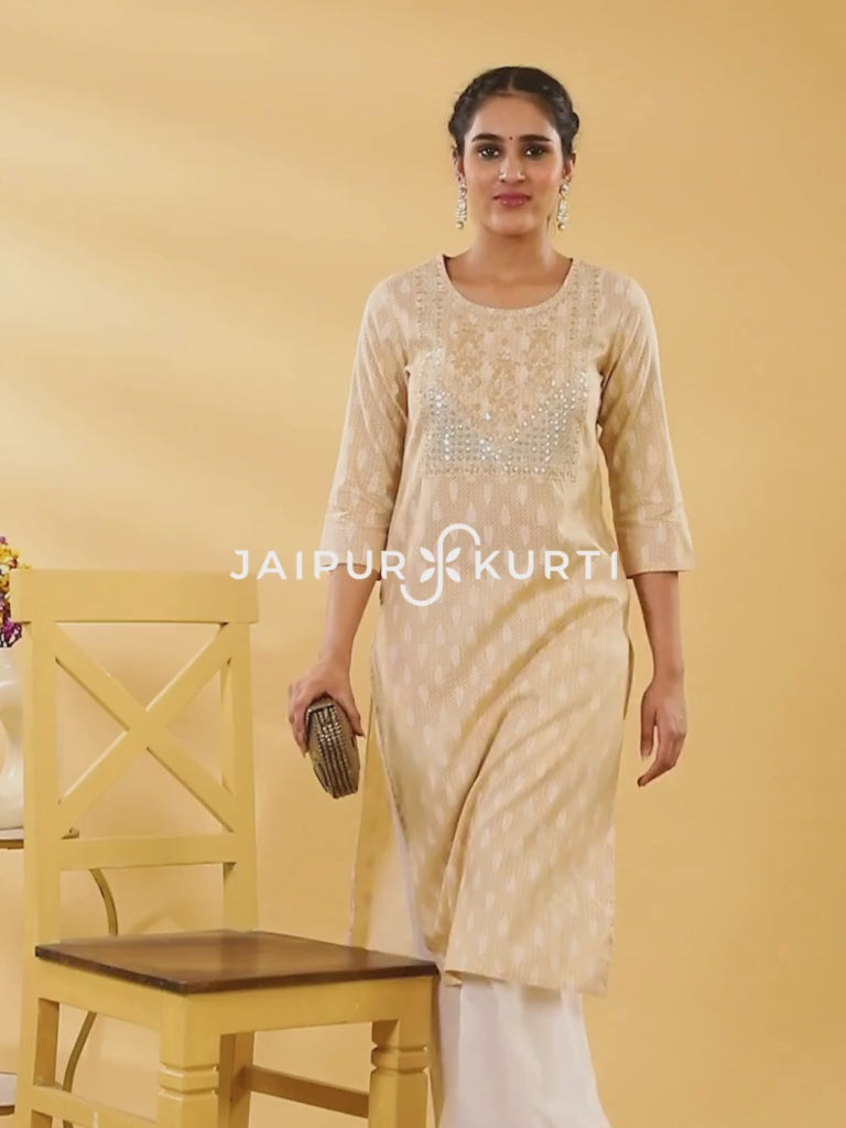 A subtle style, this Beige Ethnic Motif Printed Embroidered Straight Kurta has a round neckline, three-quarter sleeves and an embroidered yoke.