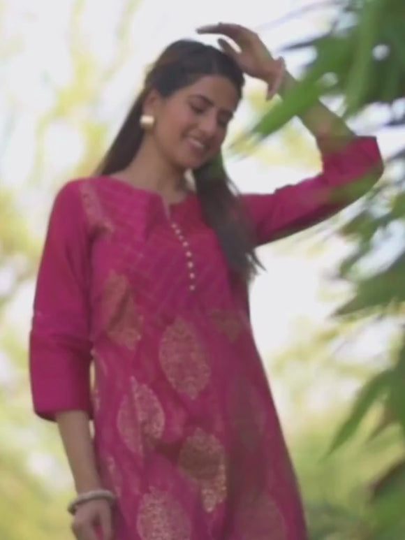 Fuchsia Foil Printed Chanderi Straight Kurta Paired With Solid Pant Sale price₹ 1,349 Regular price₹ 5,199Save 74%