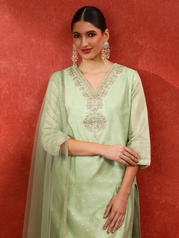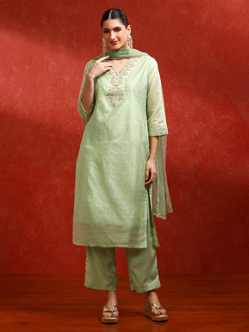 Green Tussar Silk Embellished Kurta With Trouser And Kota Doria Dupatta Sale price₹ 1,779 Regular price₹ 4,599Save 61%