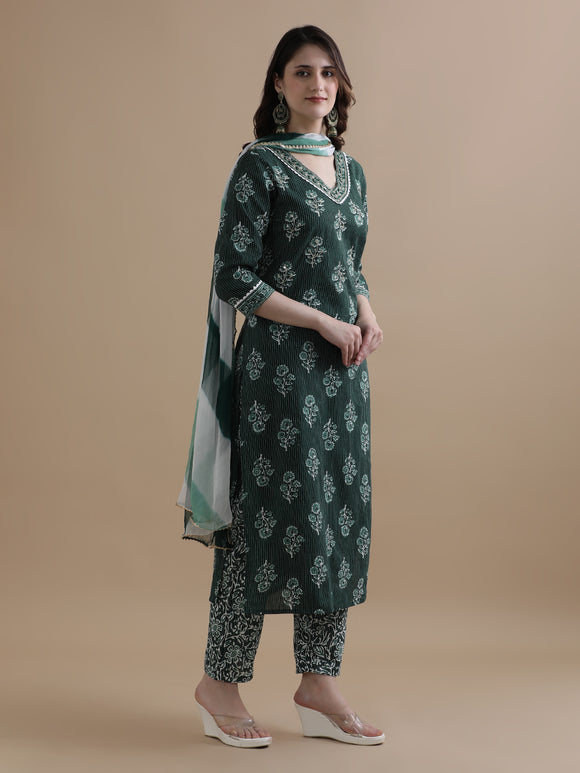 Floral Printed Kantha Work Pure Cotton Green Kurta With Pant & Chiffon Dupatta Sale price₹ 1,549 Regular price₹ 3,999Save 61%