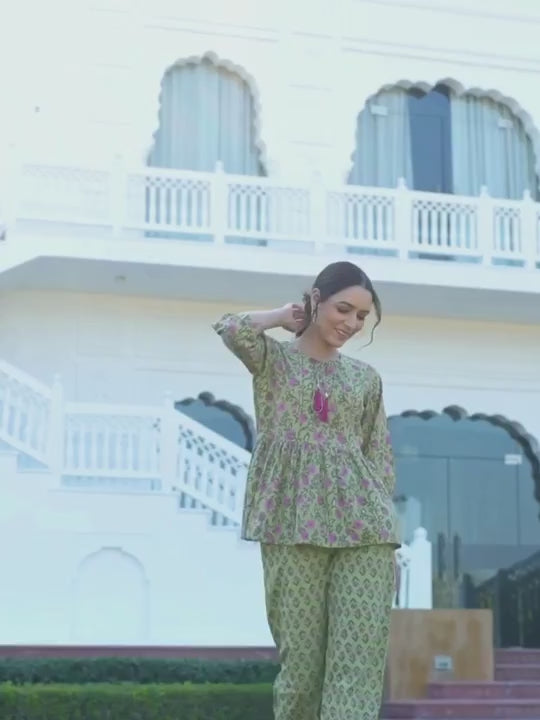 Cotton Ethnic Printed Green Lounge Wear Has Gathered Top And Pants