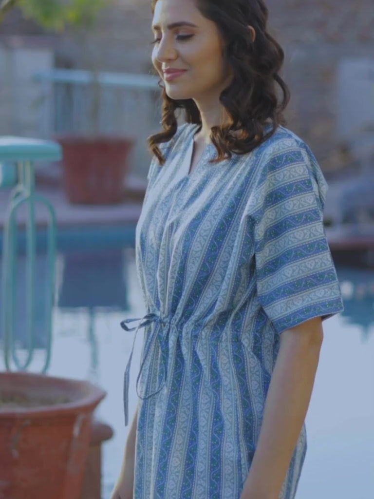 Jaipur Kurti border blue printed sleepwear consists of a short kaftan dress & pajama