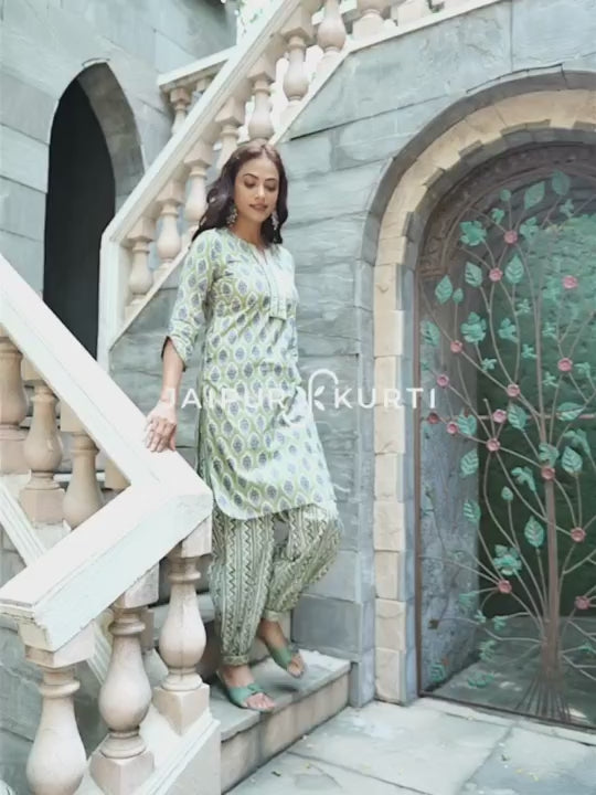 An incredible pick for your everyday ethnic wardrobe, this Olive Green Ethnic Motif Printed Straight Kurta With Zig-Zag Printed Afghani Salwar is crafted from a plush cotton fabric with an alluring hand-block print detailing. It features a round neck with a notch, border detailing with lace on the front placket, three-quarter asymmetrical sleeves, and a straight hemline with an attractive and comfortable Zig-zag printed Afghani Salwar