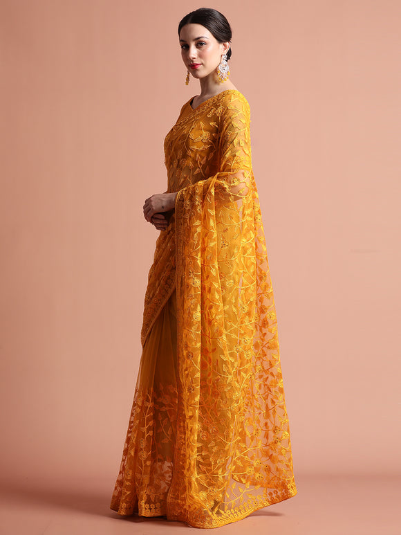 Party Wear Floral Embroidered Net Mustard Saree Sale price₹ 1,669 Regular price₹ 4,499Save 63%