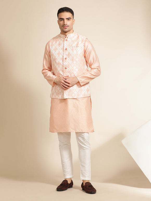 Peach Silk Blend Kurta With Woven Design Nehru Jacket Set Sale price₹ 2,899 Regular price₹ 8,299Save 65%