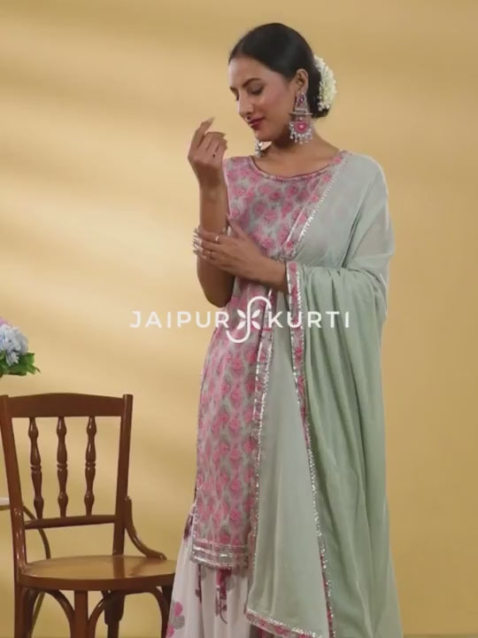 Perfect choice for your wardrobe, this Sage Green Ethnic Floral Printed Straight Kurta With White Printed Sharara And Dupatta is crafted from the beautiful hand-blocked floral printed cotton fabric with an alluring Gota lace detailing on the hems of the kurta and Sharara. The sleeveless kurta has a round neck with dori and tassel details on the back, paired with a white printed sharara with a partially elasticated waistband and two side pockets, and a solid dupatta with fabric taping on edges