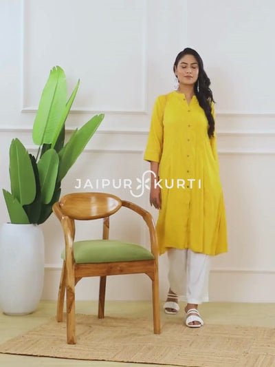 Embrace an elegant style with this Yellow Self Design A-line Kurta. It has a mandarin collar, three-quarter sleeves, kantha work and side pockets.