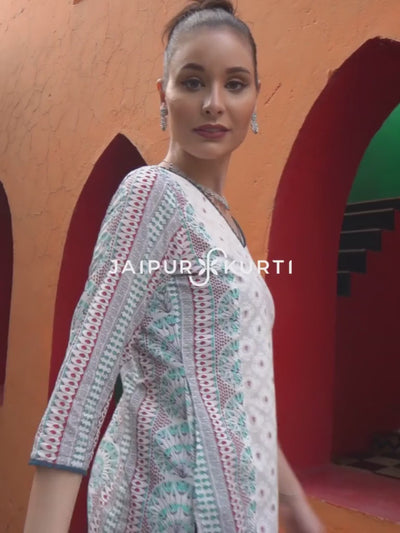 Featuring An Everyday Charm Made In Cotton Cambric Fabric. This White And Blue Ethnic Printed Straight Kurta Has A V-Neckline, Contrasting Blue Lace And Three-Quarter Sleeves. Pair It With Dark-Colored Contrasting Pants To Compliment The Look