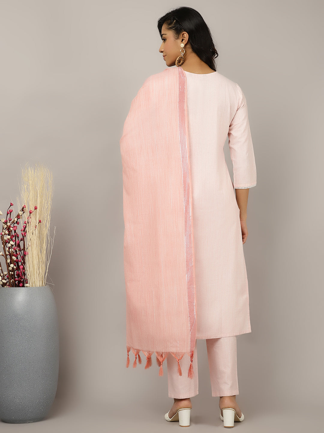 Make a statement in this Mirror Work Embroidered Festive Suit Set. The kurta has a sweetheart neck with mirror work embroidered yoke, three-quarter sleeves and a straight hemline. Paired with regular straight pants and a self-woven dupatta.