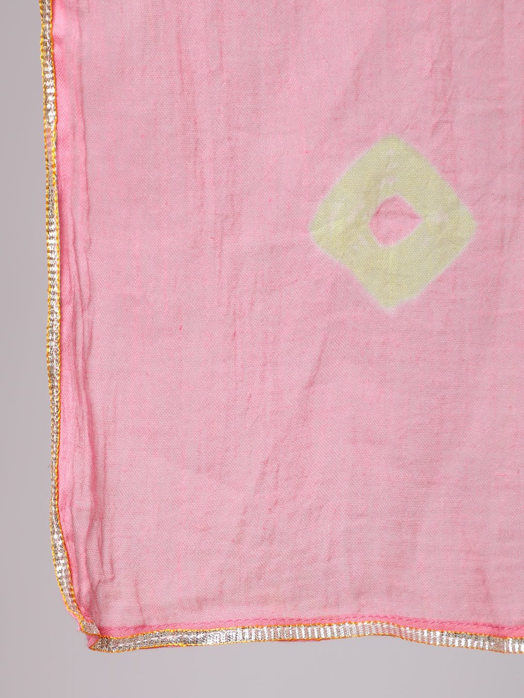 A Ethnic Print Anarkali Has A Round Neck, Jaal Printed Yoke With Gota Lace And Sequence Work Detailing,3/4Th Sleeves With Gota Lace At The Hem, Kurta Has A Flared Hem And It Has Kali Joint At The Waist, Printed Pants Has A Elastic At The Waist,Tie And Dye Pink Malmal Cotton Dupatta Has Gota Details All Over.