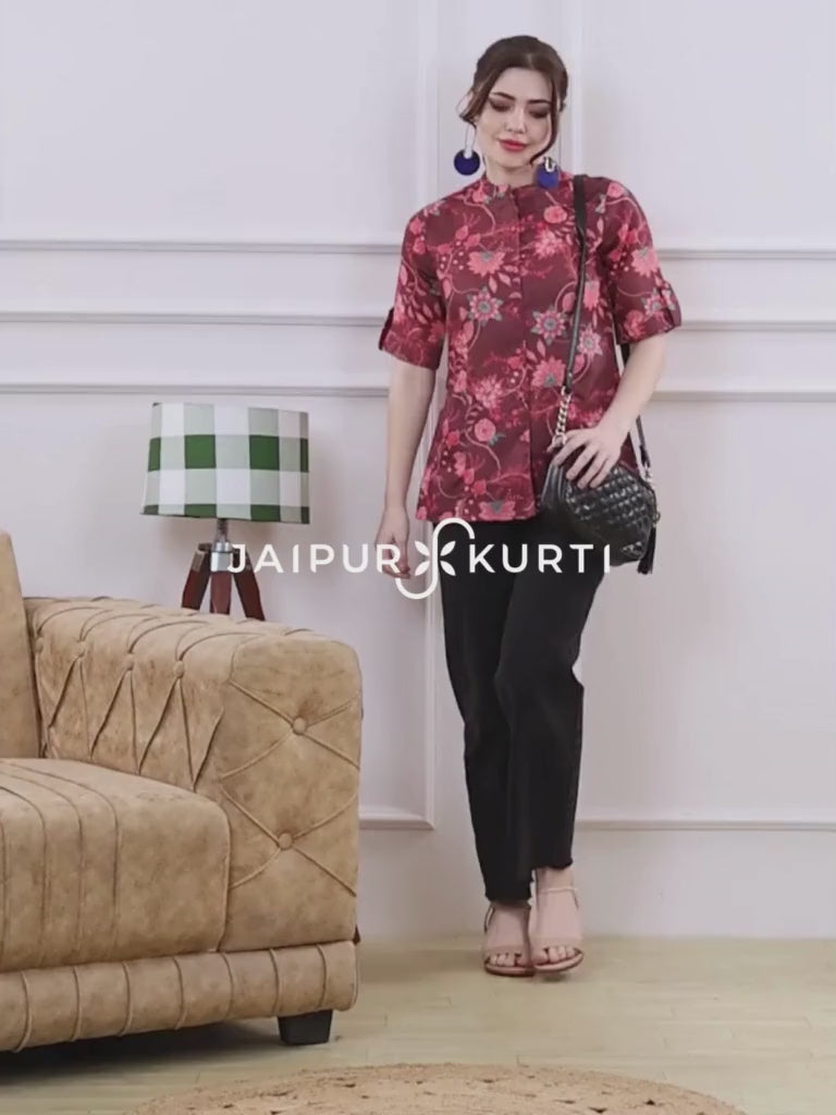 Carry a stunning look with this Brown Digital Printed Princess Cut Top. It has a mandarin collar, half-cuffed sleeves and a front button placket.
