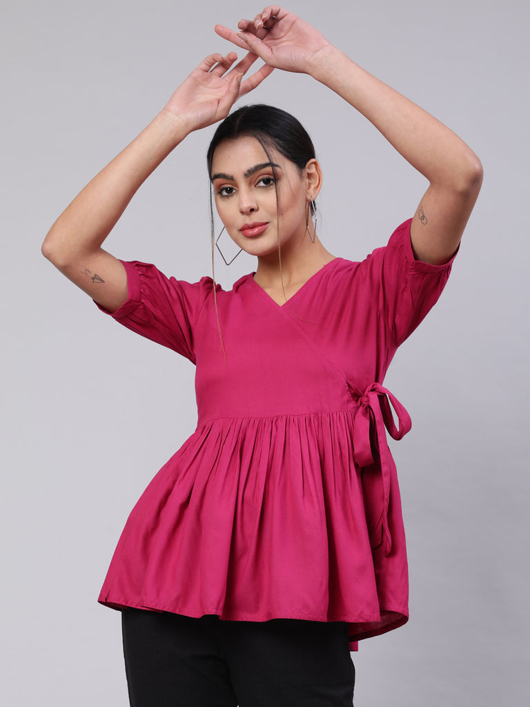 Look majestic in this Magenta Solid Peplum Tie Up Top. The stunning top is crafted from plush rayon fabric and features a V-neck with tie-up detail and gathers at the waist, and puffed sleeves.